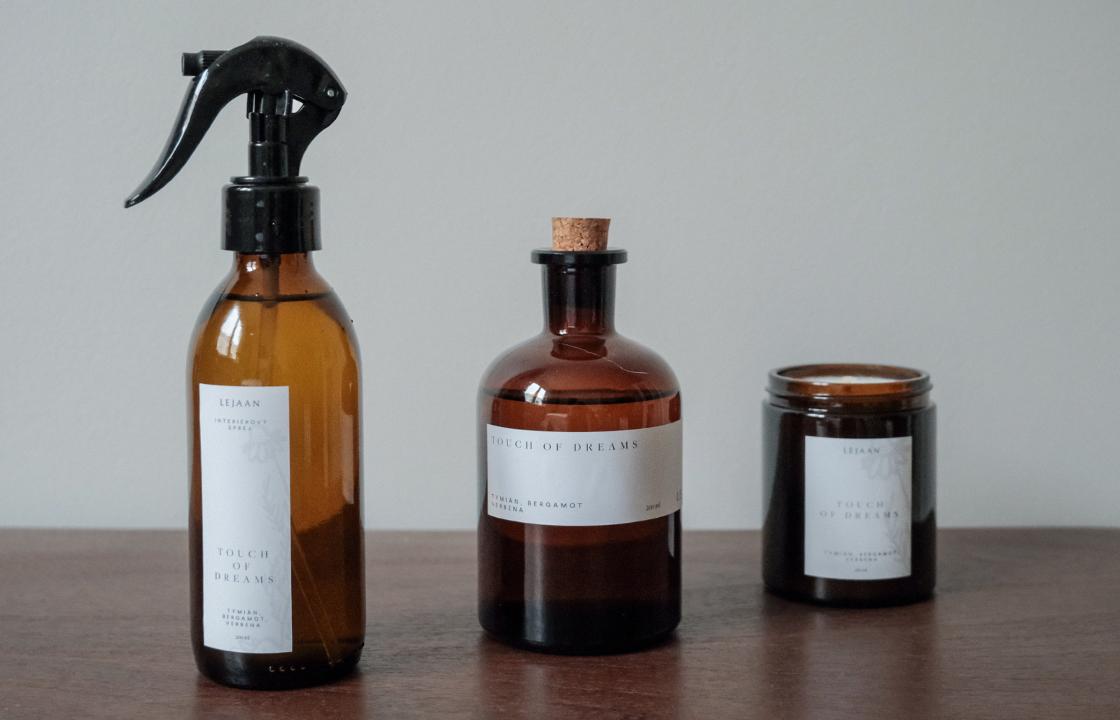 Touch of dreams zase tvoří kulisu pro soustředění i snění. Jak přírodní svíčky, tak interiérové spreje a tyčinkové difuzéry můžete pořídit buď v tónech bergamotu s jasmínem nebo růžového pepře se santalem.