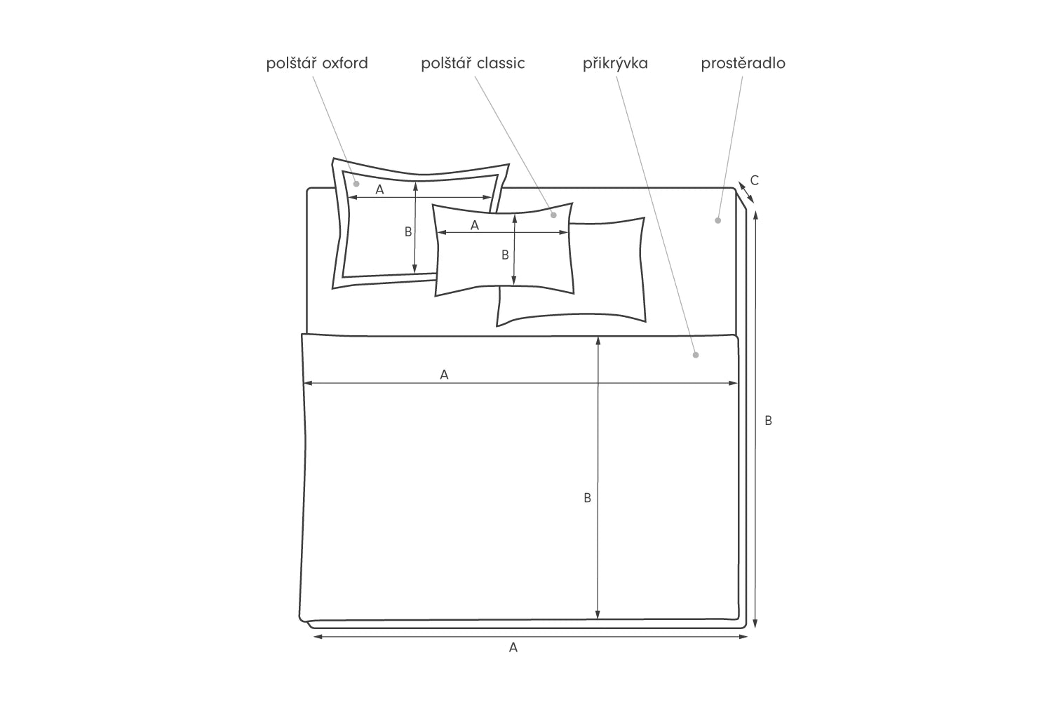 Povlak na polštář může mít hladký okraj nebo ozdobnou kantu. Rozměr povlaku je vždy udaný jako rozměr ode švu ke švu, přičemž otvor pro výplň je na straně B. Povlak peřiny má otvor také na straně A. Při měření pro objednávku prostěradla se zaměřte standardně na šířku(A) a hloubku(B), ale také na výšku matrace(C). Naše prostěradla jsou univerzálně šita pro matrace výšky 18-30cm.
